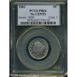 <B>1883 5C No Cents PR66 PCGS.</B></I> Pale gray color is accented by splashes of vivid golden toning. This example is sharply defined. An attractive example of the design type that is so popular with collectors today. Lot:5903