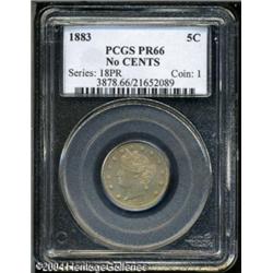 1883 5C No Cents PR66 PCGS. This eye-pleasing prem <B>1883 5C No Cents PR66 PCGS.</B></I> This eye-pleasing premium Gem displays pristine surfaces with olive and rose coloration on each side. Sharply struck except for the frequently weak reverse left ear of corn. Population: 88 in 66, 6 finer (10/04). <BR><BR><B>Important notice:</B> Heritage usually auctions material at the rate of 200-250 lots per hour. On some occasions eBay Live bid software or the Internet may not be able to keep up with the pace of the auction. We recommend placing a realistic absentee bid now as insurance to avoid disappointment. Occasionally the auctioneer may eliminate or reject an eBay Live bid, and the auctioneer may also reopen a lot after the close of the eBay live bidding (usually because we missed an audience bid), and may reject your bid even if it shows you as the winning bidder. By bidding via eBay Live, you agree that Heritage may award the lot to another bidder at its sole discretion under the circumstances described above or any other reasonable circumstances. Since eBay bids are not shown to us until we open the lot on the floor, we treat those bids just like floor bids. In most cases the floor responds before the eBay bid is presented to us, due to Internet lag time, so for consistency we have made it a policy that floor bids are always considered first over tie eBay live bids. Also please note that all Heritage lots purchased through eBay Live carry a 20% Buyer's Premium. Please make sure you read the Terms and Conditions before you bid. This lot is being auctioned in conjunction with a live floor auction by Heritage Galleries & Auctioneers. All final auction and invoice information will be supplied by Heritage Galleries & Auctioneers, and all other information should be considered preliminary. Lot:5538