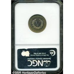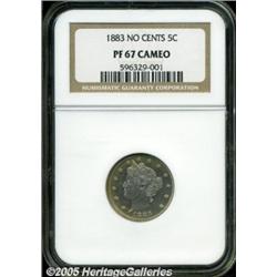 <B>1883 5C No Cents PR67 Cameo NGC.</B></I> Business strike No Cents nickels are one of the most common type coins from the 19th century. However, the availability of proof strikings of this issue are very limited, especially in Superb condition and with cameo contrast. This is an exceptionally attractive proof striking that is deeply mirrored with sharp contrast against the frosted devices. Most of each side is pale aqua-blue while the margins are outlined with medium golden-brown coloration. A spot-free, gleaming example of this important one-year type coin. Population: 10 in 67, 0 finer (2/05).