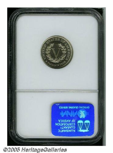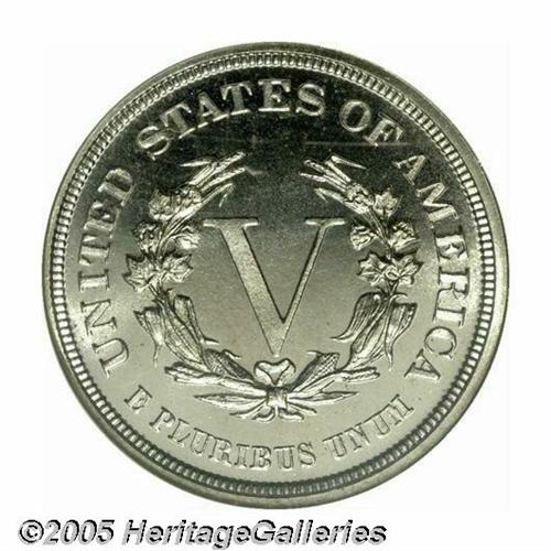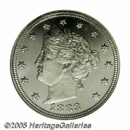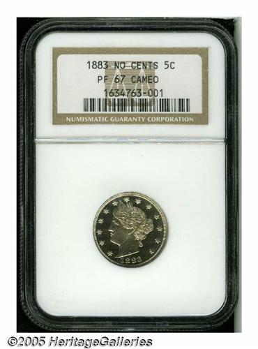 <B>1883<5C> No Cents PR67 Cameo NGC.</B></I> The 1883 No Cents Liberty Nickel was widely saved at the time of issue and is a common coin even today. However, 1883 proofs are no more available (and considerably less so than many other dates), with obvious pressure on this issue by proof type collectors. This piece shows a completely untoned appearance over each side. The fields are deeply mirrored with thick mint frost over the devices. A Superb example of this popular proof issue and unexcelled in grade at either service. Population: 11 in 67, 0 finer (4/05).<BR><I>From The Western Hills Collection.</B></I>