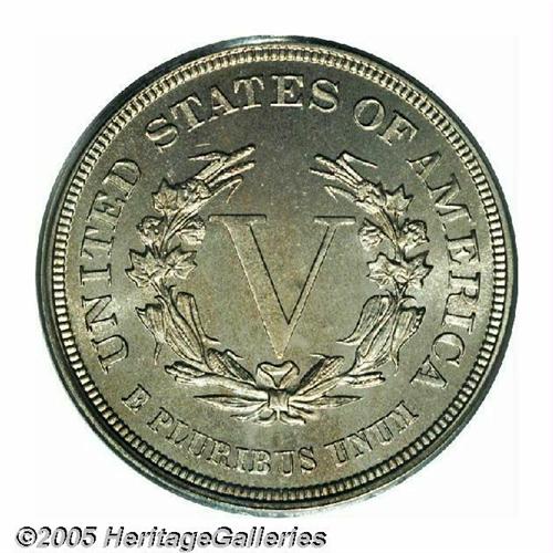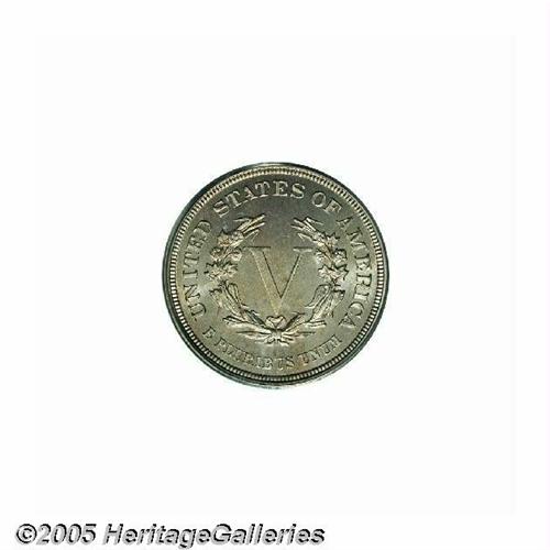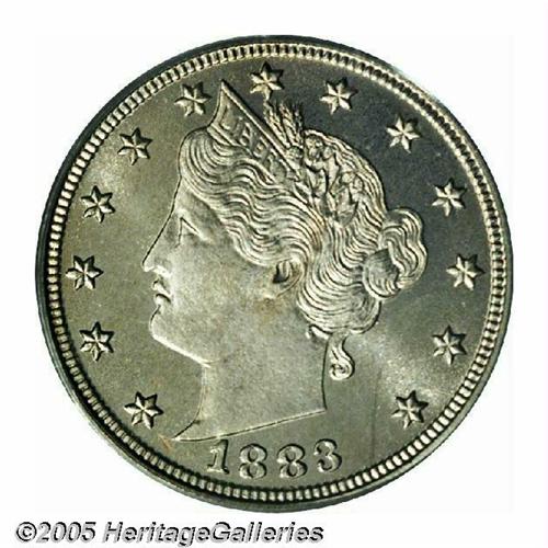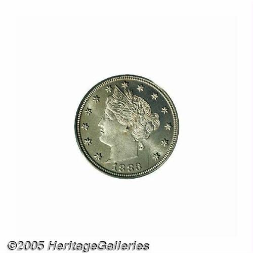<B>1883<5C> No Cents PR67 Cameo PCGS.</B></I> While it may be commonplace to call No Cents Nickels "common," it would be a mistake to believe that proofs, and especially high grade proofs are common. High grade proofs of this date are only slightly more available than other early dates in the Liberty Nickel series, yet they are many times more desirable because they represent this popular one-year type. This Superb cameo displays a thin veneer of speckled light tan color, with deeply mirrored fields and noticeably frosted devices. The design elements are exquisitely struck, and the pristine surfaces are devoid of significant marks. Population: 11 in 67, 0 finer (6/05).<BR><I>From The Melrose Bay Collection.</B></I>