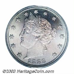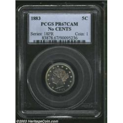 <TABLE cellSpacing=0 cellPadding=0 width="100%" bgColor=#000000 border=0><TBODY><TR><TD width="100%"><TABLE cellSpacing=1 cellPadding=3 width="100%" border=0><TBODY><TR><TD width="100%" bgColor=#79735c><FONT face=arial color=#ffffff size=3><B>Description</B> </FONT></TD></TR><TR><TD width="100%" bgColor=#ffffff><FONT face=arial size=2><B>1883 5C No Cents PR67 Cameo PCGS.</B></I> The 1883 No Cents nickel was widely saved at the time of issue and is a common coin even today. However, proofs of this issue are no more available (and considerably less so than other dates), with considerable pressure on this issue by proof type collectors. This piece shows just the faintest accent of rose and lilac toning over each side and the fields are deeply mirrored with thick mint frost over the devices. A Superb example of this popular proof issue and unexcelled in grade at either service. Population: 1 in 67, 0 finer (8/03). </FONT></TD></TR></TBODY></TABLE></TD></TR></TBODY></TABLE><BR><A name=PricesRealized></A><TABLE cellSpacing=0 cellPadding=0 width="100%" bgColor=#000000 border=0><TBODY><TR><TD width="100%"><TABLE cellSpacing=1 cellPadding=3 width="100%" border=0><TBODY><TR><TD width="100%" bgColor=#79735c><A name=PR><FONT face=arial color=#ffffff size=3><B>Previous Prices from Heritage Auctions</B> </FONT></A></TD></TR><TR><TD bgColor=#f6f6ed><TABLE cellSpacing=0 cellPadding=0 width="100%" border=1><TBODY><TR><TD align=middle width="33%"><B>Date</B></TD><TD align=middle width="33%"><B>Service</B></TD><TD align=middle width="33%"><B>Price</B></TD></TR><TR bgColor=whitesmoke><TD width="33%"><B>05/03/2003</B></TD><TD width="33%">PCGS</TD><TD width="33%">$7,187.50</TD></TR></TBODY></TABLE></TD></TR><TR><TD bgColor=#ffffff><FONT face=arial size=1 ?>PLEASE NOTE: All prices realized reflect the final hammer price PLUS the buyer's premium in auctions that charge a buyer's premium. Each item has a notation at the top of the listing indicating whether that lot included a buyer's premium. Example: A item that sells with a final hammer price of $100 and a 20% buyer's premium will display with a price realized of $120. All information listed is intended to be as accurate as possible, but errors are possible. Please use this guide carefully and inform us of any inaccuracies. </FONT></TD></TR></TBODY></TABLE></TD></TR></TBODY></TABLE><BR><TABLE cellSpacing=0 cellPadding=0 width="100%" bgColor=#000000 border=0><TBODY><TR><TD width="100%"><TABLE cellSpacing=1 cellPadding=3 width="100%" border=0><TBODY><TR><TD width="100%" bgColor=#79735c colSpan=6><FONT face=arial color=#ffffff size=3><B>Price Guide*</B> </FONT></TD></TR><TR bgColor=#f6f6ed><TD align=middle><B>Grade</B> </TD><TD align=middle><B>Coin World<BR>(Trends)</B> </TD><TD align=middle><B>Numismedia<BR>Retail</B> </TD><TD align=middle><B>Numismedia<BR>Wholesale</B> </TD><TD align=middle><B>Coin<BR>Universe</B> </TD><TD align=middle><B>Heritage<BR>Value Index</B> </TD></TR><TR bgColor=#ffffff><TD align=middle>66</TD><TD align=right>---</TD><TD align=right>---</TD><TD align=right>---</TD><TD align=right>$1,500.00</TD><TD align=right>$1,190.00</TD></TR><TR style="FONT-WEIGHT: bold" bgColor=#cccfdd><TD align=middle>67</TD><TD align=right>---</TD><TD align=right>---</TD><TD align=right>---</TD><TD align=right>---</TD><TD align=right>---</TD></TR><TR bgColor=#ffffff><TD align=middle>68</TD><TD align=right>---</TD><TD align=right>---</TD><TD align=right>---</TD><TD align=right>---</TD><TD align=right>---</TD></TR><TR bgColor=#ffffff><TD colSpan=6><FONT size=1>*All information listed is intended to be as accurate as possible, but errors are possible. No item may be returned or refused based on this information which is provided as a service to our customers. You should contact each pricing source directly to determine the accuracy of this information. </FONT></TD></TR></TBODY></TABLE></TD></TR></TBODY></TABLE><BR><TABLE cellSpacing=0 cellPadding=0 width="100%" bgColor=#000000 border=0><TBODY><TR><TD width="100%"><TABLE cellSpacing=1 cellPadding=3 width="100%" border=0><TBODY><TR><TD width="100%" bgColor=#79735c><FONT face=arial color=#ffffff size=3><B>Population Guide</B> </FONT></TD></TR><TR bgColor=#ffffff><TD align=middle><!-- Begin Output of Population Grid--><TABLE cellSpacing=0 cellPadding=0 width="100%" border=0><TBODY><TR><TD vAlign=center><TABLE cellSpacing=0 width="100%" border=1 cellsadding="3"><TBODY><TR><TD vAlign=center><TABLE cellSpacing=0 cellPadding=3 width="100%" border=1><TBODY><TR><TD vAlign=center align=middle bgColor=#f0f1e8 colSpan=2 <CENTER><FONT face=Arial size=2><B>PCGS Pop </B></FONT><CENTER></CENTER></TD><TD vAlign=center align=middle bgColor=#f0f1e8 colSpan=2><CENTER><FONT face=Arial size=2><B>NGC Pop</B></CENTER></FONT></TD></TR><TR><TD vAlign=center><FONT face=Arial size=2>(67)</FONT> </TD><TD vAlign=center align=right><FONT face=Arial size=2>1</FONT> </TD><TD vAlign=center><FONT face=Arial size=2>(67)</FONT> </TD><TD vAlign=center align=right><FONT face=Arial size=2>6</FONT> </TD></TR><TR><TD vAlign=center><FONT face=Arial size=2>(>67)</FONT> </TD><TD vAlign=center align=right><FONT face=Arial size=2>0</FONT> </TD><TD vAlign=center><FONT face=Arial size=2>(>67)</FONT> </TD><TD vAlign=center align=right><FONT face=Arial size=2>0</FONT> </TD></TR></TBODY></TABLE></TD></TR></TBODY></TABLE></TD></TR></TBODY></TABLE><!-- End Output of Population Grid--> Important notice: Heritage usually auctions material at the rate of 200-250 lots per hour. On some occasions eBay Live bid software or the Internet may not be able to keep up with the pace of the auction. We recommend placing a realistic absentee bid now as insurance to avoid disappointment. Occasionally the auctioneer may eliminate or reject an eBay Live bid, and the auctioneer may also reopen a lot after the close of the eBay live bidding (usually because we missed an audience bid), and may reject your bid even if it shows you as the winning bidder. By bidding via eBay Live, you agree t