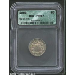 1883 5C No Cents PR67 ICG. The ICG insert includes the attribution "NO CENTS," but this coin is defi