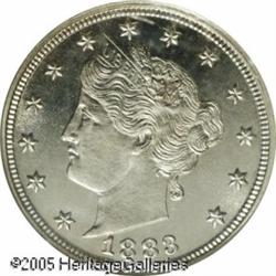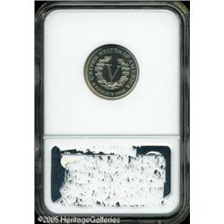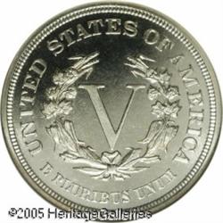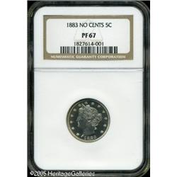 <B>1883 5C No Cents PR67 NGC.</B></I> A brightly mirrored specimen with pinpoint sharpness and an almost total absence of toning. More than 5,000 proofs were produced of this first year type, but only a tiny fraction could possibly survive this nice. Population: 18 in 67, 0 finer (1/05). Lot:5904
