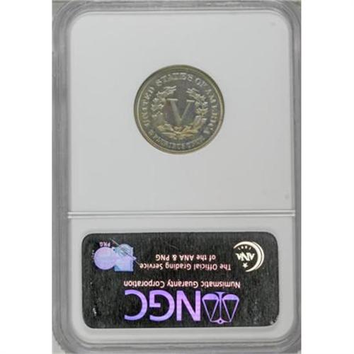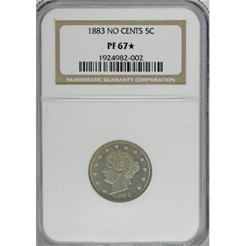 <B>1883 5C No Cents PR67 NGC.</B></I> Despite the large proof mintage approaching 7,000 pieces, attrition and the ravages of time have taken their toll on the survivors, and this piece is one of only a couple of dozen graded so fine at both services combined. Hints of gold, rose, and ice-blue blush the surfaces on each side, complementing the bold strike and premium eye appeal. Census: 19 in 67, 0 finer (7/07).<BR><BR><B>Coin Engraver:</B> Charles E. Barber<BR><BR><b>Shipping:</b> Coins & Currency (<a target="_blank" href="http://www.heritageauctions.com/common/shipping.php">view shipping information</a>\)