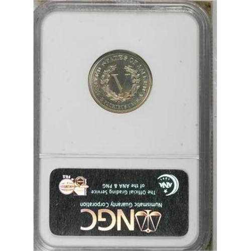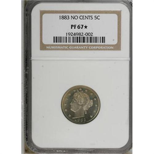 <B>1883 5C No Cents PR67 <img src="/images/star.gif" width="10" height="10" alt="" border="0"> NGC. CAC.</B></I> A total of 5,219 1883 NO CENTS nickels were struck in proof format. While NGC has assigned PR67 to only 19 of the 679 No Cents proofs it has seen, it has given the coveted Star designation to a mere four examples; the service has seen no coins finer (11/07). The PR67 <B><img src="/images/star.gif" width="10" height="10" alt="" border="0"></B></I> offered here exhibits a mix of soft powder-blue, gold-beige, and lilac colors. A sharp strike complements the delicate patina, and there are no mentionable marks or spots. A minute indentation on Liberty's neck, and a trivial mark over the lower right corn ear help to identify the piece. <BR><BR><B>Coin Engraver:</B> Charles E. Barber<BR><BR><b>Shipping:</b> Coins & Currency (<a target="_blank" href="http://www.heritageauctions.com/common/shipping.php">view shipping information</a>)
