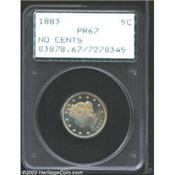 <TR><TD width="100%"><TABLE cellSpacing=1 cellPadding=3 width="100%" border=0><TBODY><TR><TD width="100%" bgColor=#79735c><FONT face=arial color=#ffffff size=3><B>Description</B> </FONT></TD></TR><TR><TD width="100%" bgColor=#ffffff><FONT face=arial size=2><B>1883 5C No Cents PR67 PCGS.</B></I> The 1883 No Cents nickel has a surprisingly low certified population in PR67 for a first-year issue that was widely saved. A mere twenty-three Superb Gems are reported at NGC and PCGS combined, with none finer (4/03). Both sides of the currently offered example are silky smooth, with no contact marks. Razor-sharp throughout, the pristine devices float over moderately reflective fields. The lovely olive and yellow-gold colors are interrupted over part of each side by splashes of bright apricot iridescence. Though a rather high mintage proof issue, this coin's one-year status as a type adds considerably to its appeal. </FONT></TD></TR></TBODY></TABLE></TD></TR></TBODY></TABLE><BR><A name=PricesRealized></A><TABLE cellSpacing=0 cellPadding=0 width="100%" bgColor=#000000 border=0><TBODY><TR><TD width="100%"><TABLE cellSpacing=1 cellPadding=3 width="100%" border=0><TBODY><TR><TD width="100%" bgColor=#79735c><A name=PR><FONT face=arial color=#ffffff size=3><B>Previous Prices from Heritage Auctions</B> </FONT></A></TD></TR><TR><TD bgColor=#f6f6ed><TABLE cellSpacing=0 cellPadding=0 width="100%" border=1><TBODY><TR><TD align=middle width="33%"><B>Date</B></TD><TD align=middle width="33%"><B>Service</B></TD><TD align=middle width="33%"><B>Price</B></TD></TR><TR bgColor=whitesmoke><TD width="33%"><B>08/09/2000</B></TD><TD width="33%">PCGS</TD><TD width="33%">$3,680.00</TD></TR><TR bgColor=whitesmoke><TD width="33%"><B>10/01/1996</B></TD><TD width="33%">PCGS</TD><TD width="33%">$675.00</TD></TR><TR bgColor=whitesmoke><TD width="33%"><B>01/08/2002</B></TD><TD width="33%">NGC</TD><TD width="33%">$2,760.00</TD></TR><TR bgColor=whitesmoke><TD width="33%"><B>03/22/1997</B></TD><TD width="33%">NGC</TD><TD width="33%">$2,760.00</TD></TR></TBODY></TABLE></TD></TR><TR><TD bgColor=#ffffff><FONT face=arial size=1 ?>PLEASE NOTE: All prices realized reflect the final hammer price PLUS the buyer's premium in auctions that charge a buyer's premium. Each item has a notation at the top of the listing indicating whether that lot included a buyer's premium. Example: A item that sells with a final hammer price of $100 and a 20% buyer's premium will display with a price realized of $120. All information listed is intended to be as accurate as possible, but errors are possible. Please use this guide carefully and inform us of any inaccuracies. </FONT></TD></TR></TBODY></TABLE></TD></TR></TBODY></TABLE><BR><TABLE cellSpacing=0 cellPadding=0 width="100%" bgColor=#000000 border=0><TBODY><TR><TD width="100%"><TABLE cellSpacing=1 cellPadding=3 width="100%" border=0><TBODY><TR><TD width="100%" bgColor=#79735c colSpan=6><FONT face=arial color=#ffffff size=3><B>Price Guide*</B> </FONT></TD></TR><TR bgColor=#f6f6ed><TD align=middle><B>Grade</B> </TD><TD align=middle><B>Coin World<BR>(Trends)</B> </TD><TD align=middle><B>Numismedia<BR>Retail</B> </TD><TD align=middle><B>Numismedia<BR>Wholesale</B> </TD><TD align=middle><B>Coin<BR>Universe</B> </TD><TD align=middle><B>Heritage<BR>Value Index</B> </TD></TR><TR bgColor=#ffffff><TD align=middle>66</TD><TD align=right>---</TD><TD align=right>---</TD><TD align=right>$1,025.00</TD><TD align=right>$1,550.00</TD><TD align=right>$933.50</TD></TR><TR style="FONT-WEIGHT: bold" bgColor=#cccfdd><TD align=middle>67</TD><TD align=right>---</TD><TD align=right>---</TD><TD align=right>$3,350.00</TD><TD align=right>$5,750.00</TD><TD align=right>$4,025.00</TD></TR><TR bgColor=#ffffff><TD align=middle>68</TD><TD align=right>---</TD><TD align=right>---</TD><TD align=right>---</TD><TD align=right>---</TD><TD align=right>---</TD></TR><TR bgColor=#ffffff><TD colSpan=6><FONT size=1>*All information listed is intended to be as accurate as possible, but errors are possible. No item may be returned or refused based on this information which is provided as a service to our customers. You should contact each pricing source directly to determine the accuracy of this information. </FONT></TD></TR></TBODY></TABLE></TD></TR></TBODY></TABLE><BR><TABLE cellSpacing=0 cellPadding=0 width="100%" bgColor=#000000 border=0><TBODY><TR><TD width="100%"><TABLE cellSpacing=1 cellPadding=3 width="100%" border=0><TBODY><TR><TD width="100%" bgColor=#79735c><FONT face=arial color=#ffffff size=3><B>Population Guide</B> </FONT></TD></TR><TR bgColor=#ffffff><TD align=middle><!-- Begin Output of Population Grid--><TABLE cellSpacing=0 cellPadding=0 width="100%" border=0><TBODY><TR><TD vAlign=center><TABLE cellSpacing=0 width="100%" border=1 cellsadding="3"><TBODY><TR><TD vAlign=center><TABLE cellSpacing=0 cellPadding=3 width="100%" border=1><TBODY><TR><TD vAlign=center align=middle bgColor=#f0f1e8 colSpan=2 <CENTER><FONT face=Arial size=2><B>PCGS Pop </B></FONT><CENTER></CENTER></TD><TD vAlign=center align=middle bgColor=#f0f1e8 colSpan=2><CENTER><FONT face=Arial size=2><B>NGC Pop</B></CENTER></FONT></TD></TR><TR><TD vAlign=center><FONT face=Arial size=2>(67)</FONT> </TD><TD vAlign=center align=right><FONT face=Arial size=2>7</FONT> </TD><TD vAlign=center><FONT face=Arial size=2>(67)</FONT> </TD><TD vAlign=center align=right><FONT face=Arial size=2>16</FONT> </TD></TR><TR><TD vAlign=center><FONT face=Arial size=2>(>67)</FONT> </TD><TD vAlign=center align=right><FONT face=Arial size=2>0</FONT> </TD><TD vAlign=center><FONT face=Arial size=2>(>67)</FONT> </TD><TD vAlign=center align=right><FONT face=Arial size=2>0</FONT> </TD></TR></TBODY></TABLE></TD></TR></TBODY></TABLE></TD></TR></TBODY></TABLE><!-- End Output of Population Grid--></TD></TR></TBODY></TABLE></TD></TR></TBODY></TABLE><BR><TABLE cellSpacing=0 cellPadding=0 width="100%" bgColor=#000000 border=0><TBODY><TR> Important notice: We expect to be auctioning lots at the rate of 200-250 per 