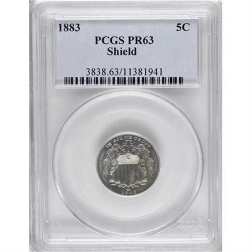 <B>1883 5C PR63 PCGS.</B></I> . PCGS Population (116/948). NGC Census: (60/830). Mintage: 5,419. Numismedia Wsl. Price for NGC/PCGS coin in PR63: $265. (#3838)<BR><BR><B>Coin Engraver:</B> James B. Longacre<BR><BR><b>Shipping:</b> Coins & Currency (<a target="_blank" href="http://www.heritageauctions.com/common/shipping.php">view shipping information</a>)