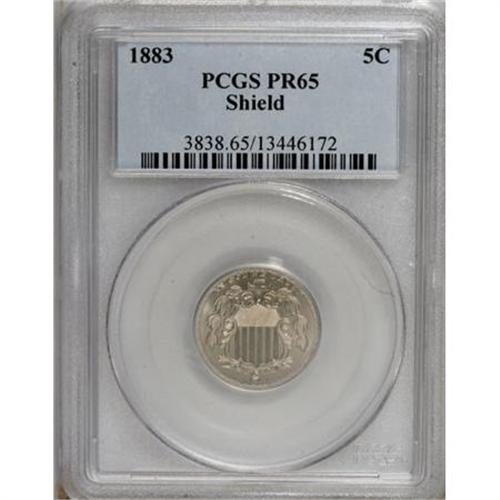 <B>1883 5C PR65 PCGS.</B></I> PCGS Population (393/201). NGC Census: (330/246). Mintage: 5,419. Numismedia Wsl. Price for NGC/PCGS coin in PR65: $620. (#3838)<BR><BR><B>Coin Engraver:</B> James B. Longacre<BR><BR><b>Shipping:</b> Coins & Currency (<a target="_blank" href="http://www.heritageauctions.com/common/shipping.php">view shipping information</a>)