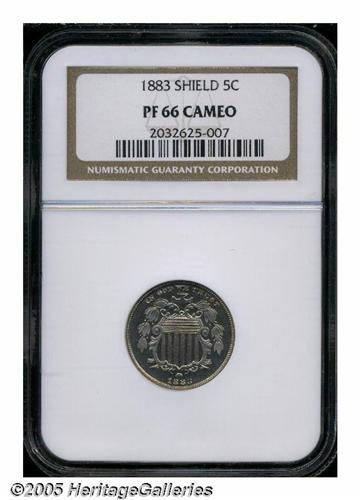 <B>1883<5C> PR66 Cameo NGC.</B></I> Sharply struck and well preserved, with light patina, mild cameo contrast on both sides, and a pair of small contact marks, both located on the reverse. A splendid premium quality Gem. Population: 19 in 66, 7 finer (3/05).