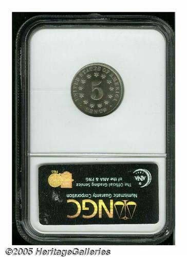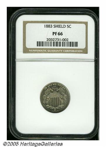 <B>1883<5C> PR66 NGC.</B></I> A lovely Gem example having sharp design elements and nicely reflective fields. Both surfaces exhibit a whisper of delicate golden-gray iridescence. Coined during the final year of the design type. A mere 5,419 proof examples of the issue were minted.