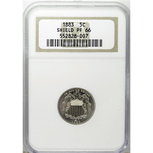 <B>1883 5C PR66 NGC.</B></I> A pleasing Premium Gem that has suitably bold devices and light golden toning. This highly appealing representative comes from the final year of issue.<BR><I>From The Cocoa Beach Collection.</B></I><BR><BR><b>Shipping:</b> Coin/Currency (<a target="_blank" href="http://www.heritageauctions.com/common/shipping.php">view shipping information</a>)