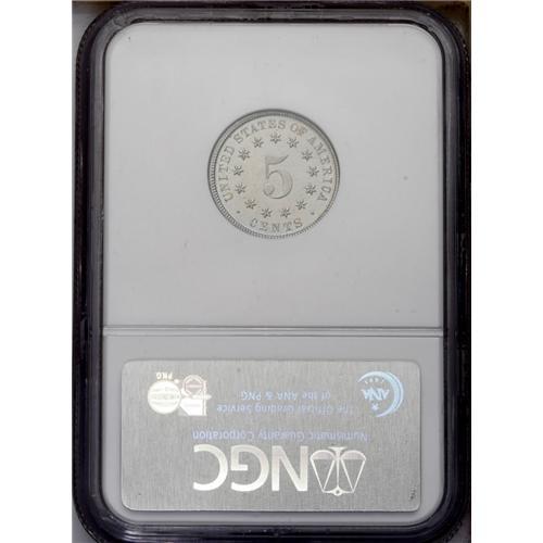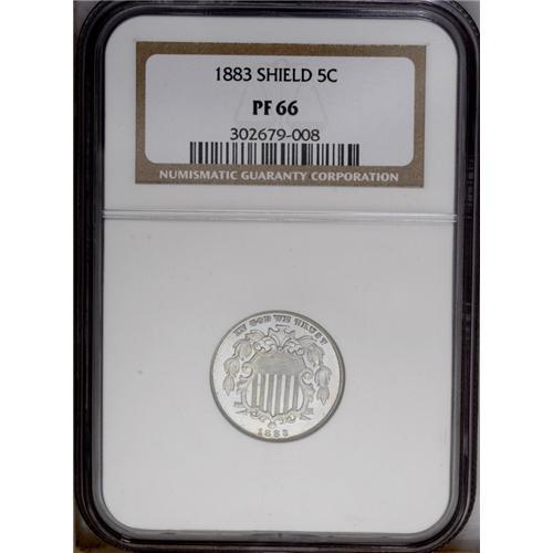 <B>1883<5C> PR66 NGC.</B></I> Some delicate ice-blue iridescence dances across the moderately reflective surfaces of this original-appearing example. Some mottled milky patina is seen near the center of the reverse, and neither side reveals any grade-limiting blemishes.