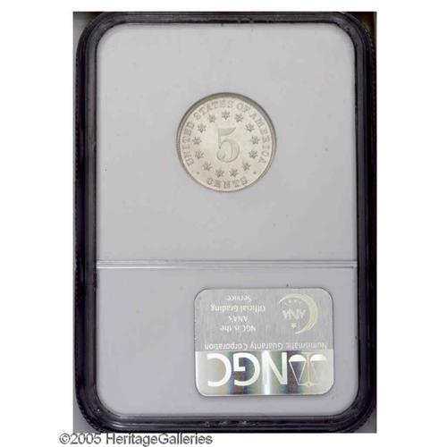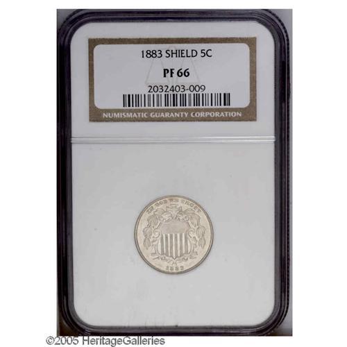<B>1883<5C> PR66 NGC.</B></I> Wisps of apricot patina grace this well struck and flashy premium Gem. Beautifully preserved, since a curly lintmark above the 83 in the date is of mint origin. A transitional year with three types offered as proofs.