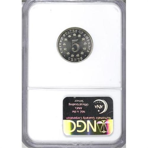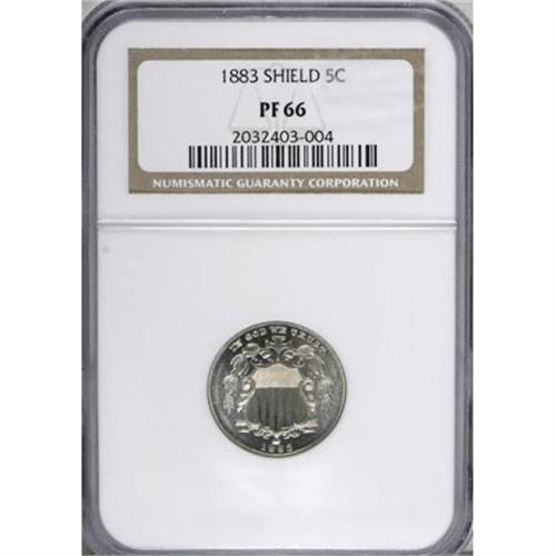 <B>1883 5C PR66 NGC.</B></I> A gleaming and sharply struck representative of this final-year proof Shield nickel issue, exquisitely preserved with a touch of peach toning in the centers. The obverse shows a modicum of contrast.<BR><BR><B>Coin Engraver:</B> James B. Longacre<BR><BR><b>Shipping:</b> Coins & Currency (<a target="_blank" href="http://www.heritageauctions.com/common/shipping.php">view shipping information</a>)
