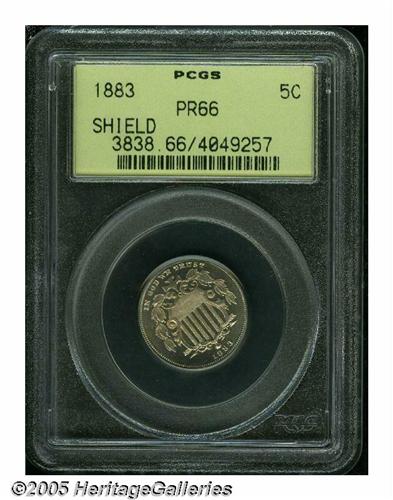 <B>1883<5C> PR66 PCGS.</B></I> A scintillating Premium Gem that is endowed with pinpoint sharpness and displays peerless, glassy fields under splashes of light golden patina. Collectors of final year type would be hard-pressed to find a more appealing proof 1883 Shield Nickel.