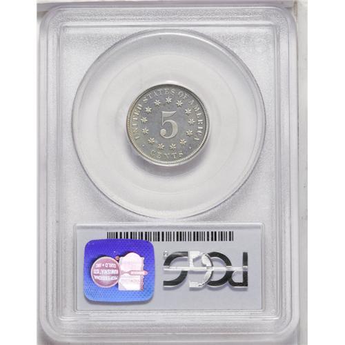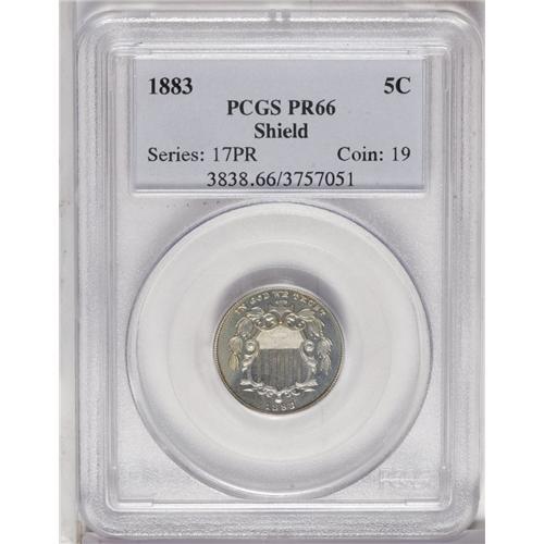 <B>1883<5C> PR66 PCGS.</B></I> All of the design elements are sharply struck and the unmarked surfaces display pleasing gold and olive-blue toning. Noticeable doubling occurs on the letters of the obverse motto.