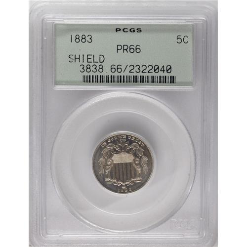 <B>1883 5C PR66 PCGS.</B></I> From the final year of issue for the Shield Nickel series comes this superior example. It has illimitable depth of reflectivity in the fields, and each side shows a couple of streaks of light reddish patina.<BR><BR><b>Shipping:</b> Coin/Currency (<a target="_blank" href="http://www.heritageauctions.com/common/shipping.php">view shipping information</a>)