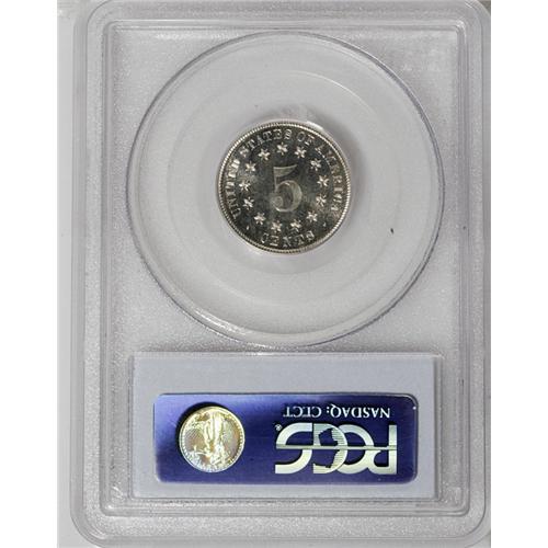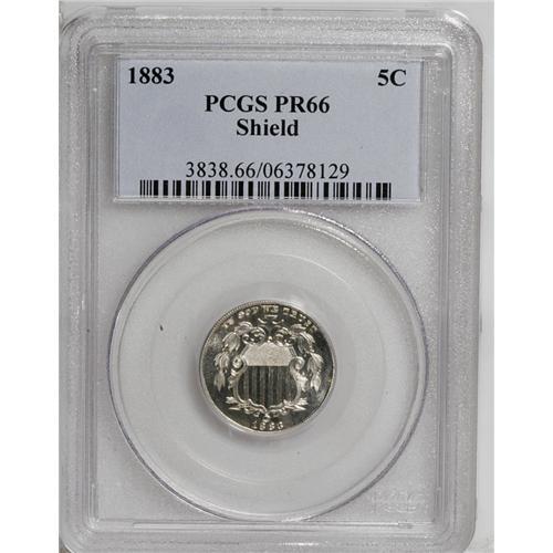 <B>1883<5C> PR66 PCGS.</B></I> The raised lines of the shield display a touch of dusty rose. A deeply mirrored coin with metallic gray surfaces, with one tiny contact mark noted on the rightmost raised line of the shield.