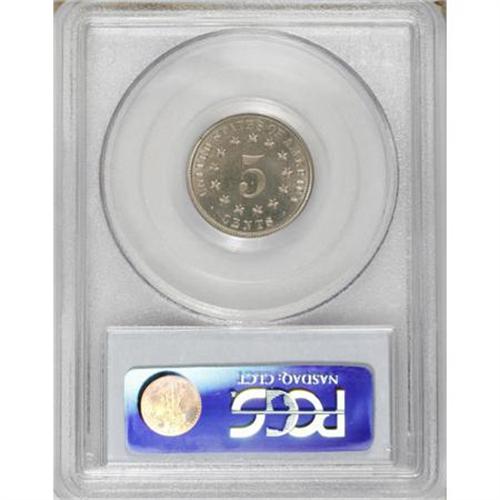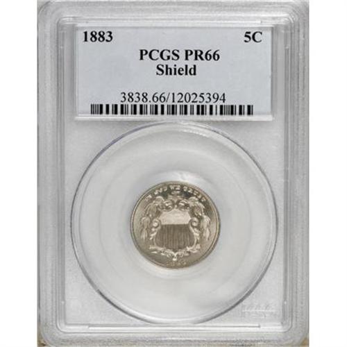 <B>1883 5C PR66 PCGS.</B></I> Despite its place as the highest-mintage proof Shield nickel issue, the final-year 1883 pieces are highly elusive any finer than this. Delicate green and gold tints visit the slightly hazy nickel-gray surfaces of this sharply struck Premium Gem.<BR><BR><B>Coin Engraver:</B> James B. Longacre<BR><BR><b>Shipping:</b> Coins & Currency (<a target="_blank" href="http://www.heritageauctions.com/common/shipping.php">view shipping information</a>)