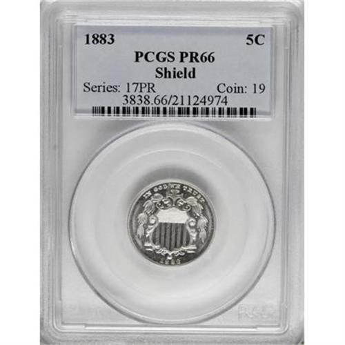 <B>1883 5C PR66 PCGS.</B></I> PCGS Population (184/20). NGC Census: (205/45). Mintage: 5,419. Numismedia Wsl. Price for NGC/PCGS coin in PR66: $900. (#3838)<BR><BR><B>Coin Engraver:</B> James B. Longacre<BR><BR><b>Shipping:</b> Coins & Currency (<a target="_blank" href="http://www.heritageauctions.com/common/shipping.php">view shipping information</a>)