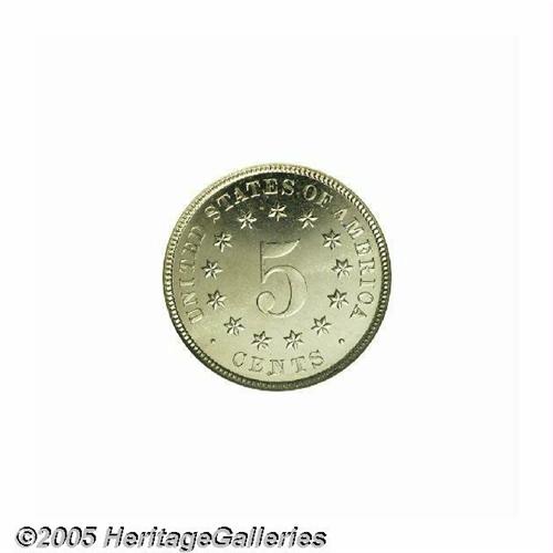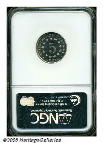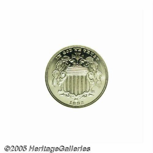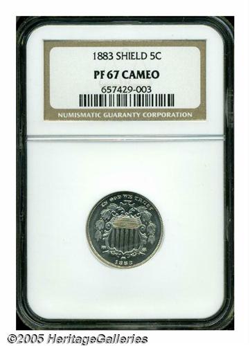 <B>1883<5C> PR67 Cameo NGC.</B></I> With silky-smooth surfaces and razor sharp striking definition, this Superb Gem undoubtedly qualifies for Condition Census standing. The fields shimmer with glassy reflectivity, whereas the devices are warmly frosted in finish. All features are devoid of grade-limiting handling marks. A perfect coin for inclusion in the final-year proof type set of a collector who demands the utmost in technical and aesthetic quality. Both major grading services report a mere 15 coins in PR67 Cameo, and there are none finer (6/05).