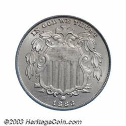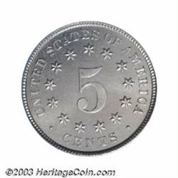 <TR><TD width="100%"><TABLE cellSpacing=1 cellPadding=3 width="100%" border=0><TBODY><TR><TD width="100%" bgColor=#79735c><FONT face=arial color=#ffffff size=3><B>Description</B> </FONT></TD></TR><TR><TD width="100%" bgColor=#ffffff><FONT face=arial size=2><B>1883 5C PR67 ICG.</B></I> The ICG insert includes the attribution "NO CENTS," but this coin is definitely a Shield Nickel. The final-year 1883 is the most plentiful proof Shield Nickel in terms of total number of coins known. At the Superb Gem level of preservation, however, this issue is elusive. The razor sharp devices rise powerfully above moderately bright fields. Both sides are golden-gray in sheen with nary a distracting blemish to report. </FONT></TD></TR></TBODY></TABLE></TD></TR></TBODY></TABLE><BR><A name=PricesRealized></A><TABLE cellSpacing=0 cellPadding=0 width="100%" bgColor=#000000 border=0><TBODY><TR><TD width="100%"><TABLE cellSpacing=1 cellPadding=3 width="100%" border=0><TBODY><TR><TD width="100%" bgColor=#79735c><A name=PR><FONT face=arial color=#ffffff size=3><B>Previous Prices from Heritage Auctions</B> </FONT></A></TD></TR><TR><TD bgColor=#f6f6ed><TABLE cellSpacing=0 cellPadding=0 width="100%" border=1><TBODY><TR><TD align=middle width="33%"><B>Date</B></TD><TD align=middle width="33%"><B>Service</B></TD><TD align=middle width="33%"><B>Price</B></TD></TR><TR bgColor=whitesmoke><TD width="33%"><B>01/11/2003</B></TD><TD width="33%">PCGS</TD><TD width="33%">$3,105.00</TD></TR><TR bgColor=whitesmoke><TD width="33%"><B>01/06/1993</B></TD><TD width="33%">PCGS</TD><TD width="33%">$1,430.00</TD></TR><TR bgColor=whitesmoke><TD width="33%"><B>10/07/1995</B></TD><TD width="33%">NGC</TD><TD width="33%">$1,320.00</TD></TR><TR bgColor=whitesmoke><TD width="33%"><B>09/01/1998</B></TD><TD width="33%">NGC</TD><TD width="33%">$1,725.00</TD></TR></TBODY></TABLE></TD></TR><TR><TD bgColor=#ffffff><FONT face=arial size=1 ?>PLEASE NOTE: All prices realized reflect the final hammer price PLUS the buyer's premium in auctions that charge a buyer's premium. Each item has a notation at the top of the listing indicating whether that lot included a buyer's premium. Example: A item that sells with a final hammer price of $100 and a 20% buyer's premium will display with a price realized of $120. All information listed is intended to be as accurate as possible, but errors are possible. Please use this guide carefully and inform us of any inaccuracies. </FONT></TD></TR></TBODY></TABLE></TD></TR></TBODY></TABLE><BR><TABLE cellSpacing=0 cellPadding=0 width="100%" bgColor=#000000 border=0><TBODY><TR><TD width="100%"><TABLE cellSpacing=1 cellPadding=3 width="100%" border=0><TBODY><TR><TD width="100%" bgColor=#79735c colSpan=6><FONT face=arial color=#ffffff size=3><B>Price Guide*</B> </FONT></TD></TR><TR bgColor=#f6f6ed><TD align=middle><B>Grade</B> </TD><TD align=middle><B>Coin World<BR>(Trends)</B> </TD><TD align=middle><B>Numismedia<BR>Retail</B> </TD><TD align=middle><B>Numismedia<BR>Wholesale</B> </TD><TD align=middle><B>Coin<BR>Universe</B> </TD><TD align=middle><B>Heritage<BR>Value Index</B> </TD></TR><TR bgColor=#ffffff><TD align=middle>66</TD><TD align=right>---</TD><TD align=right>---</TD><TD align=right>$825.00</TD><TD align=right>$950.00</TD><TD align=right>$612.50</TD></TR><TR style="FONT-WEIGHT: bold" bgColor=#cccfdd><TD align=middle>67</TD><TD align=right>---</TD><TD align=right>---</TD><TD align=right>$1,500.00</TD><TD align=right>$2,500.00</TD><TD align=right>$3,002.50</TD></TR><TR bgColor=#ffffff><TD align=middle>68</TD><TD align=right>---</TD><TD align=right>---</TD><TD align=right>$7,500.00</TD><TD align=right>---</TD><TD align=right>---</TD></TR><TR bgColor=#ffffff><TD colSpan=6><FONT size=1>*All information listed is intended to be as accurate as possible, but errors are possible. No item may be returned or refused based on this information which is provided as a service to our customers. You should contact each pricing source directly to determine the accuracy of this information. </FONT></TD></TR></TBODY></TABLE></TD></TR></TBODY></TABLE><BR><TABLE cellSpacing=0 cellPadding=0 width="100%" bgColor=#000000 border=0><TBODY><TR><TD width="100%"><TABLE cellSpacing=1 cellPadding=3 width="100%" border=0><TBODY><TR><TD width="100%" bgColor=#79735c><FONT face=arial color=#ffffff size=3><B>Population Guide</B> </FONT></TD></TR><TR bgColor=#ffffff><TD align=middle><!-- Begin Output of Population Grid--><TABLE cellSpacing=0 cellPadding=0 width="100%" border=0><TBODY><TR><TD vAlign=center><TABLE cellSpacing=0 width="100%" border=1 cellsadding="3"><TBODY><TR><TD vAlign=center><TABLE cellSpacing=0 cellPadding=3 width="100%" border=1><TBODY><TR><TD vAlign=center align=middle bgColor=#f0f1e8 colSpan=2 <CENTER><FONT face=Arial size=2><B>PCGS Pop </B></FONT><CENTER></CENTER></TD><TD vAlign=center align=middle bgColor=#f0f1e8 colSpan=2><CENTER><FONT face=Arial size=2><B>NGC Pop</B></CENTER></FONT></TD></TR><TR><TD vAlign=center><FONT face=Arial size=2>(67)</FONT> </TD><TD vAlign=center align=right><FONT face=Arial size=2>18</FONT> </TD><TD vAlign=center><FONT face=Arial size=2>(67)</FONT> </TD><TD vAlign=center align=right><FONT face=Arial size=2>31</FONT> </TD></TR><TR><TD vAlign=center><FONT face=Arial size=2>(>67)</FONT> </TD><TD vAlign=center align=right><FONT face=Arial size=2>0</FONT> </TD><TD vAlign=center><FONT face=Arial size=2>(>67)</FONT> </TD><TD vAlign=center align=right><FONT face=Arial size=2>1</FONT> </TD></TR></TBODY></TABLE></TD></TR></TBODY></TABLE></TD></TR></TBODY></TABLE><!-- End Output of Population Grid--></TD></TR></TBODY></TABLE></TD></TR></TBODY></TABLE><BR><TABLE cellSpacing=0 cellPadding=0 width="100%" bgColor=#000000 border=0><TBODY><TR> Important notice: We expect to be auctioning lots at the rate of 200-250 per hour. On occasion eBay live bid software cannot keep up with the pace of the auctions where 4-5 lots per minute can hammer down, so we recommend that you place a realistic absentee bid now as insurance to 