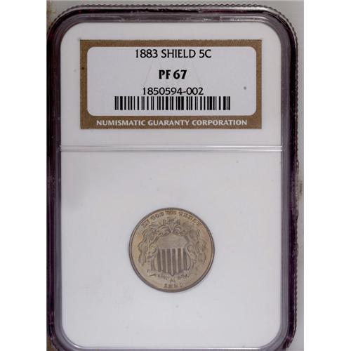 <B>1883<5C> PR67 NGC.</B></I> Both sides of this highly reflective and crisply detailed Superb Gem display lovely gold-olive patina. NGC has certified just one finer non-Cameo example (7/06).