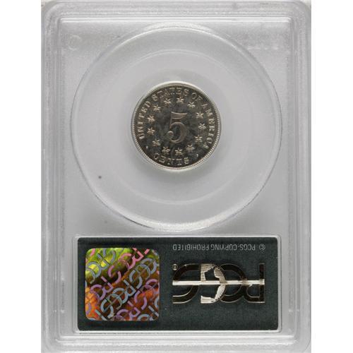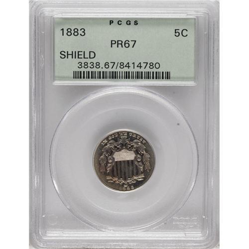 <B>1883 5C PR67 PCGS.</B></I> Elegant gold and green patina graces the shining surfaces of this final-year Shield nickel. The motto IN GOD WE TRUST has a pronounced appearance due to extra outlines along the contours of the letters. This Superb Gem is tied for the finest graded by PCGS (4/07).<BR><BR><b>Shipping:</b> Coins & Currency (<a target="_blank" href="http://www.heritageauctions.com/common/shipping.php">view shipping information</a>)