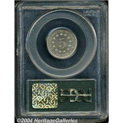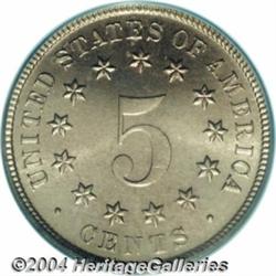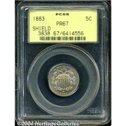<B>1883<5C> PR67 PCGS.</B></I> A razor-sharp Superb Gem that has every horizontal bar within the shield boldly defined. Light golden-brown patina graces the essentially immaculate surfaces. The final proof issue in the series, the 1883 also has the highest mintage, as contemporary collectors desired a souvenir of the passing type. However, only a handful of survivors can match the exquisite preservation of the present specimen. Encapsulated in an older green label PCGS holder. Population: 20 in 67, 0 finer (7/04). <BR><BR><B>Important notice:</B> Heritage usually auctions material at the rate of 200-250 lots per hour. On some occasions eBay Live bid software or the Internet may not be able to keep up with the pace of the auction. We recommend placing a realistic absentee bid now as insurance to avoid disappointment. Occasionally the auctioneer may eliminate or reject an eBay Live bid, and the auctioneer may also reopen a lot after the close of the eBay live bidding (usually because we missed an audience bid), and may reject your bid even if it shows you as the winning bidder. By bidding via eBay Live, you agree that Heritage may award the lot to another bidder at its sole discretion under the circumstances described above or any other reasonable circumstances. Since eBay bids are not shown to us until we open the lot on the floor, we treat those bids just like floor bids. In most cases the floor responds before the eBay bid is presented to us, due to Internet lag time, so for consistency we have made it a policy that floor bids are always considered first over tie eBay live bids. Also please note that all Heritage lots purchased through eBay Live carry a 20% Buyer's Premium. Please make sure you read the Terms and Conditions before you bid. </span></font></tr></table></td></tr></table>