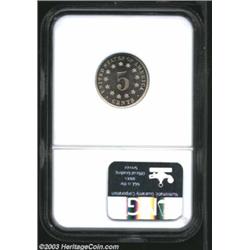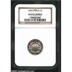 <TABLE cellSpacing=0 cellPadding=0 width="100%" bgColor=#000000 border=0><TBODY><TR><TD width="100%"><TABLE cellSpacing=1 cellPadding=3 width="100%" border=0><TBODY><TR><TD width="100%" bgColor=#79735c><FONT face=arial color=#ffffff size=3><B>Description</B> </FONT></TD></TR><TR><TD width="100%" bgColor=#ffffff><FONT face=arial size=2><B>1883 5C Shield PR65 Cameo NGC.</B></I> This beautiful Gem proof displays flashy, gleaming reflectivity and notable cameo contrast on both obverse and reverse. The gold and lilac-gray surfaces seem free of hairlines or handling marks.<BR><I>From The Jones Beach Estate, Part I.</B></I> </FONT></TD></TR></TBODY></TABLE></TD></TR></TBODY></TABLE><BR><A name=PricesRealized></A><TABLE cellSpacing=0 cellPadding=0 width="100%" bgColor=#000000 border=0><TBODY><TR><TD width="100%"><TABLE cellSpacing=1 cellPadding=3 width="100%" border=0><TBODY><TR><TD width="100%" bgColor=#79735c><A name=PR><FONT face=arial color=#ffffff size=3><B>Previous Prices from Heritage Auctions</B> </FONT></A></TD></TR><TR><TD bgColor=#f6f6ed><TABLE cellSpacing=0 cellPadding=0 width="100%" border=1><TBODY><TR><TD align=middle width="33%"><B>Date</B></TD><TD align=middle width="33%"><B>Service</B></TD><TD align=middle width="33%"><B>Price</B></TD></TR><TR bgColor=whitesmoke><TD width="33%"><B>03/01/2003</B></TD><TD width="33%">PCGS</TD><TD width="33%">$517.50</TD></TR><TR bgColor=whitesmoke><TD width="33%"><B>03/25/2003</B></TD><TD width="33%">PCGS</TD><TD width="33%">$603.75</TD></TR><TR bgColor=whitesmoke><TD width="33%"><B>09/17/2002</B></TD><TD width="33%">PCGS</TD><TD width="33%">$483.00</TD></TR></TBODY></TABLE></TD></TR><TR><TD bgColor=#ffffff><FONT face=arial size=1 ?>PLEASE NOTE: All prices realized reflect the final hammer price PLUS the buyer's premium in auctions that charge a buyer's premium. Each item has a notation at the top of the listing indicating whether that lot included a buyer's premium. Example: A item that sells with a final hammer price of $100 and a 20% buyer's premium will display with a price realized of $120. All information listed is intended to be as accurate as possible, but errors are possible. Please use this guide carefully and inform us of any inaccuracies. </FONT></TD></TR></TBODY></TABLE></TD></TR></TBODY></TABLE><BR><TABLE cellSpacing=0 cellPadding=0 width="100%" bgColor=#000000 border=0><TBODY><TR><TD width="100%"><TABLE cellSpacing=1 cellPadding=3 width="100%" border=0><TBODY><TR><TD width="100%" bgColor=#79735c colSpan=6><FONT face=arial color=#ffffff size=3><B>Price Guide*</B> </FONT></TD></TR><TR bgColor=#f6f6ed><TD align=middle><B>Grade</B> </TD><TD align=middle><B>Coin World<BR>(Trends)</B> </TD><TD align=middle><B>Numismedia<BR>Retail</B> </TD><TD align=middle><B>Numismedia<BR>Wholesale</B> </TD><TD align=middle><B>Coin<BR>Universe</B> </TD><TD align=middle><B>Heritage<BR>Value Index</B> </TD></TR><TR bgColor=#ffffff><TD align=middle>64</TD><TD align=right>---</TD><TD align=right>---</TD><TD align=right>---</TD><TD align=right>---</TD><TD align=right>$293.50</TD></TR><TR style="FONT-WEIGHT: bold" bgColor=#cccfdd><TD align=middle>65</TD><TD align=right>---</TD><TD align=right>---</TD><TD align=right>---</TD><TD align=right>---</TD><TD align=right>$453.75</TD></TR><TR bgColor=#ffffff><TD align=middle>66</TD><TD align=right>---</TD><TD align=right>---</TD><TD align=right>---</TD><TD align=right>---</TD><TD align=right>---</TD></TR><TR bgColor=#ffffff><TD colSpan=6><FONT size=1>*All information listed is intended to be as accurate as possible, but errors are possible. No item may be returned or refused based on this information which is provided as a service to our customers. You should contact each pricing source directly to determine the accuracy of this information. </FONT></TD></TR></TBODY></TABLE></TD></TR></TBODY></TABLE><BR><TABLE cellSpacing=0 cellPadding=0 width="100%" bgColor=#000000 border=0><TBODY><TR><TD width="100%"><TABLE cellSpacing=1 cellPadding=3 width="100%" border=0><TBODY><TR><TD width="100%" bgColor=#79735c><FONT face=arial color=#ffffff size=3><B>Population Guide</B> </FONT></TD></TR><TR bgColor=#ffffff><TD align=middle><!-- Begin Output of Population Grid--><TABLE cellSpacing=0 cellPadding=0 width="100%" border=0><TBODY><TR><TD vAlign=center><TABLE cellSpacing=0 width="100%" border=1 cellsadding="3"><TBODY><TR><TD vAlign=center><TABLE cellSpacing=0 cellPadding=3 width="100%" border=1><TBODY><TR><TD vAlign=center align=middle bgColor=#f0f1e8 colSpan=2 <CENTER><FONT face=Arial size=2><B>PCGS Pop </B></FONT><CENTER></CENTER></TD><TD vAlign=center align=middle bgColor=#f0f1e8 colSpan=2><CENTER><FONT face=Arial size=2><B>NGC Pop</B></CENTER></FONT></TD></TR><TR><TD vAlign=center><FONT face=Arial size=2>(65)</FONT> </TD><TD vAlign=center align=right><FONT face=Arial size=2>11</FONT> </TD><TD vAlign=center><FONT face=Arial size=2>(65)</FONT> </TD><TD vAlign=center align=right><FONT face=Arial size=2>2</FONT> </TD></TR><TR><TD vAlign=center><FONT face=Arial size=2>(>65)</FONT> </TD><TD vAlign=center align=right><FONT face=Arial size=2>16</FONT> </TD><TD vAlign=center><FONT face=Arial size=2>(>65)</FONT> </TD><TD vAlign=center align=right><FONT face=Arial size=2>11</FONT> </TD></TR></TBODY></TABLE></TD></TR></TBODY></TABLE></TD></TR></TBODY></TABLE><!-- End Output of Population Grid--> Important notice: Heritage usually auctions material at the rate of 200-250 lots per hour. On some occasions eBay Live bid software or the Internet may not be able to keep up with the pace of the auction. We recommend placing a realistic absentee bid now as insurance to avoid disappointment. Occasionally the auctioneer may eliminate or reject an eBay Live bid, and the auctioneer may also reopen a lot after the close of the eBay live bidding (usually because we missed an audience bid), and may reject your bid even if it shows you as the winning bidder. By bidding via eBay Live, you agree that Heritage may award the lot to another bidder at its sole dis
