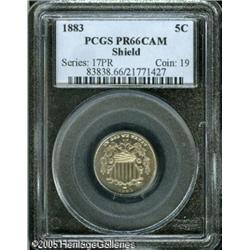 <B>1883 5C Shield PR66 Cameo PCGS.</B></I> Golden-gray patina overlays mark-free surfaces. The design elements are exquisitely struck. Population: 29 in 66, 5 finer (1/05). Lot:5867