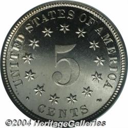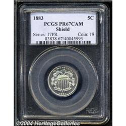 <B>1883<5C> Shield PR67 Cameo PCGS.</B></I> While not a rare date in an absolute sense, this final-year proof has a limited certified population as a Cameo, particularly at this lofty level. The otherwise brilliant surfaces yield to delicate mint frost over the devices. Both sides are essentially untoned and locating even the slightest distraction requires careful study under magnification. Population: 5 in 67 Cameo, 0 finer (2/04).<BR><I>From the Pleasant Valley Collection.</B></I> <BR><BR><B>Important notice:</B> Heritage usually auctions material at the rate of 200-250 lots per hour. On some occasions eBay Live bid software or the Internet may not be able to keep up with the pace of the auction. We recommend placing a realistic absentee bid now as insurance to avoid disappointment. Occasionally the auctioneer may eliminate or reject an eBay Live bid, and the auctioneer may also reopen a lot after the close of the eBay live bidding (usually because we missed an audience bid), and may reject your bid even if it shows you as the winning bidder. By bidding via eBay Live, you agree that Heritage may award the lot to another bidder at its sole discretion under the circumstances described above or any other reasonable circumstances. Since eBay bids are not shown to us until we open the lot on the floor, we treat those bids just like floor bids. In most cases the floor responds before the eBay bid is presented to us, due to Internet lag time, so for consistency we have made it a policy that floor bids are always considered first over tie eBay live bids. Also please note that all Heritage lots purchased through eBay Live carry a 20% Buyer's Premium. Please make sure you read the Terms and Conditions before you bid. </span></font></tr></table></td></tr></table>