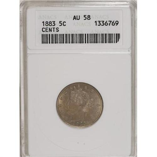<B>1883 5C With Cents AU58 ANACS.</B></I> NGC Census: (22/653). PCGS Population (75/781). Mintage: 16,032,983. Numismedia Wsl. Price for NGC/PCGS coin in AU58: $117. (#3844)<BR><BR><B>Coin Engraver:</B> Charles E. Barber<BR><BR><b>Shipping:</b> Coins & Currency (<a target="_blank" href="http://www.heritageauctions.com/common/shipping.php">view shipping information</a>)