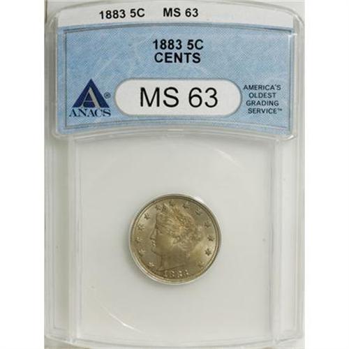 <B>1883 5C With Cents MS63 ANACS.</B></I> NGC Census: (110/445). PCGS Population (219/442). Mintage: 16,032,983. Numismedia Wsl. Price for NGC/PCGS coin in MS63: $185. (#3844)<BR><BR><B>Coin Engraver:</B> Charles E. Barber<BR><BR><b>Shipping:</b> Coins & Currency (<a target="_blank" href="http://www.heritageauctions.com/common/shipping.php">view shipping information</a>)