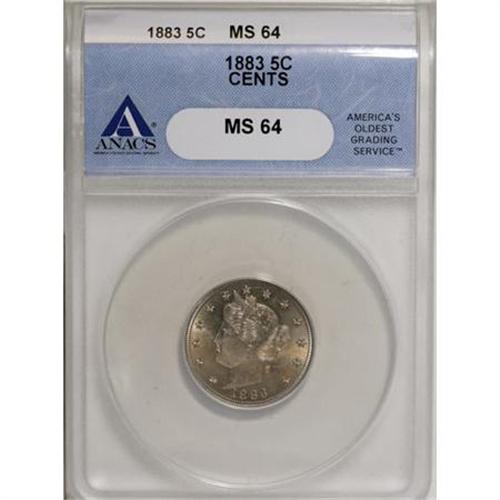 <B>1883 5C With Cents MS64 ANACS.</B></I> . NGC Census: (271/176). PCGS Population (291/163). Mintage: 16,032,983. Numismedia Wsl. Price for NGC/PCGS coin in MS64: $260. (#3844)<BR><BR><B>Coin Engraver:</B> Charles E. Barber<BR><BR><b>Shipping:</b> Coins & Currency (<a target="_blank" href="http://www.heritageauctions.com/common/shipping.php">view shipping information</a>)