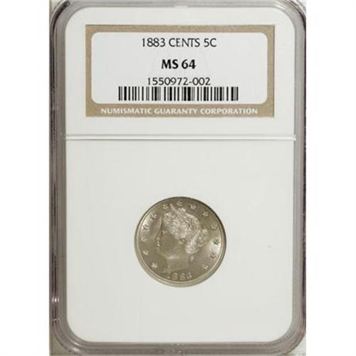 <B>1883 5C With Cents MS64 NGC.</B></I> NGC Census: (263/178). PCGS Population (281/154). Mintage: 16,032,983. Numismedia Wsl. Price for NGC/PCGS coin in MS64: $260. (#3844)<BR><BR><B>Coin Engraver:</B> Charles E. Barber<BR><BR><b>Shipping:</b> Coins & Currency (<a target="_blank" href="http://www.heritageauctions.com/common/shipping.php">view shipping information</a>\)