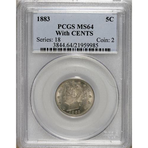 <B>1883 5C With Cents MS64 PCGS.</B></I> PCGS Population (279/150). NGC Census: (264/177). Mintage: 16,032,983. Numismedia Wsl. Price for NGC/PCGS coin in MS64: $240. (#3844)<BR><BR><b>Shipping:</b> Coins & Currency (<a target="_blank" href="http://www.heritageauctions.com/common/shipping.php">view shipping information</a>)