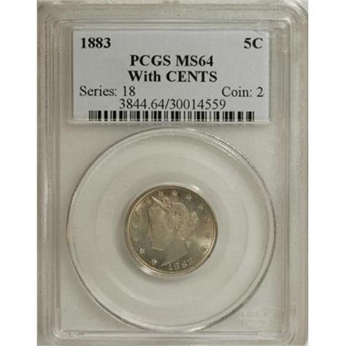 <B>1883 5C With Cents MS64 PCGS.</B></I> PCGS Population (282/157). NGC Census: (265/178). Mintage: 16,032,983. Numismedia Wsl. Price for NGC/PCGS coin in MS64: $260. (#3844)<BR><BR><B>Coin Engraver:</B> Charles E. Barber<BR><BR><b>Shipping:</b> Coins & Currency (<a target="_blank" href="http://www.heritageauctions.com/common/shipping.php">view shipping information</a>)