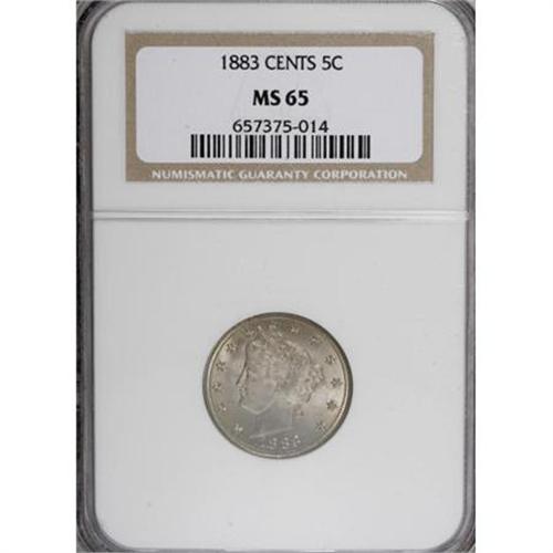 <B>1883 5C With Cents MS65 NGC.</B></I> NGC Census: (139/38). PCGS Population (115/46). Mintage: 16,032,983. Numismedia Wsl. Price for NGC/PCGS coin in MS65: $625. (#3844)<BR><BR><B>Coin Engraver:</B> Charles E. Barber<BR><BR><b>Shipping:</b> Coins & Currency (<a target="_blank" href="http://www.heritageauctions.com/common/shipping.php">view shipping information</a>)
