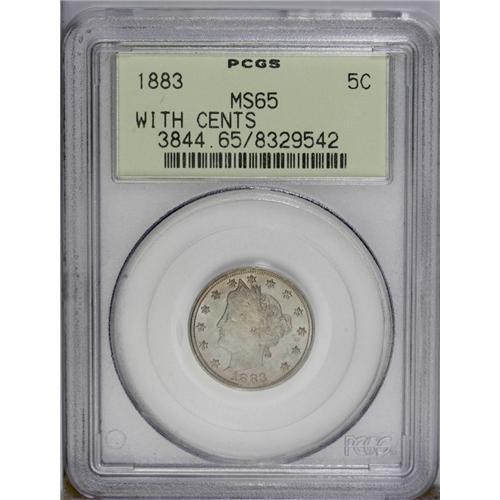 <B>1883<5C> With Cents MS65 PCGS.</B></I> Sharply struck throughout with highly lustrous surfaces that show deep aqua-blue toning and rose tinting around the margins. <BR><BR><B>Important notice:</B> Heritage usually auctions material at the rate of 200-250 lots per hour. On some occasions eBay Live bid software or the Internet may not be able to keep up with the pace of the auction. We recommend placing a realistic absentee bid now as insurance to avoid disappointment. Occasionally the auctioneer may eliminate or reject an eBay Live bid, and the auctioneer may also reopen a lot after the close of the eBay live bidding (usually because we missed an audience bid), and may reject your bid even if it shows you as the winning bidder. By bidding via eBay Live, you agree that Heritage may award the lot to another bidder at its sole discretion under the circumstances described above or any other reasonable circumstances. Since eBay bids are not shown to us until we open the lot on the floor, we treat those bids just like floor bids. In most cases the floor responds before the eBay bid is presented to us, due to Internet lag time, so for consistency we have made it a policy that floor bids are always considered first over tie eBay live bids. Also please note that all Heritage lots purchased through eBay Live carry a 20% Buyer's Premium. Please make sure you read the Terms and Conditions before you bid. This lot is being auctioned in conjunction with a live floor auction by Heritage Galleries & Auctioneers. All final auction and invoice information will be supplied by Heritage Galleries & Auctioneers, and all other information should be considered preliminary. Lot:907 <BR><BR><B>Winning Notification and Billing:</B> After the FINAL session in this auction is complete, Heritage will send e-mail and snail mail invoices. This process normally takes several days. All final auction and invoice information will be supplied by Heritage Galleries & Auctioneers, and all other information should be considered preliminary. <BR><BR>This auction will be conducted on a live auction floor and over the Internet through eBay Live. If you choose to place an absentee bid, please take a moment to <font color='#0000ff'><u><a href='http://pages.ebay.com/liveauctions/help/before/laabsentee.html'>learn how eBay Live absentee bidding works</a></u></font><font color='#000000'>