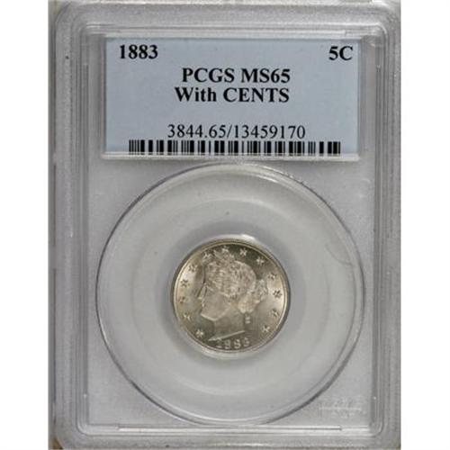 <B>1883 5C With Cents MS65 PCGS.</B></I> Though the No Cents Liberty nickels of 1883 were saved in quantity, the With Cents pieces were not given the same attention. This delightful Gem offers excellent detail and a few dots of milky patina against the lustrous nickel-gray and champagne surfaces.<BR><BR><B>Coin Engraver:</B> Charles E. Barber<BR><BR><b>Shipping:</b> Coins & Currency (<a target="_blank" href="http://www.heritageauctions.com/common/shipping.php">view shipping information</a>)