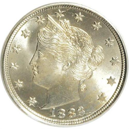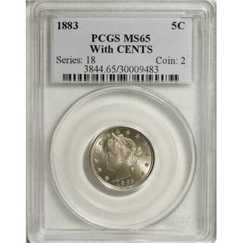 <B>1883 5C With Cents MS65 PCGS.</B></I> PCGS Population (116/47). NGC Census: (139/36). Mintage: 16,032,983. Numismedia Wsl. Price for NGC/PCGS coin in MS65: $625. (#3844)<BR><BR><B>Coin Engraver:</B> Charles E. Barber<BR><BR><b>Shipping:</b> Coins & Currency (<a target="_blank" href="http://www.heritageauctions.com/common/shipping.php">view shipping information</a>)