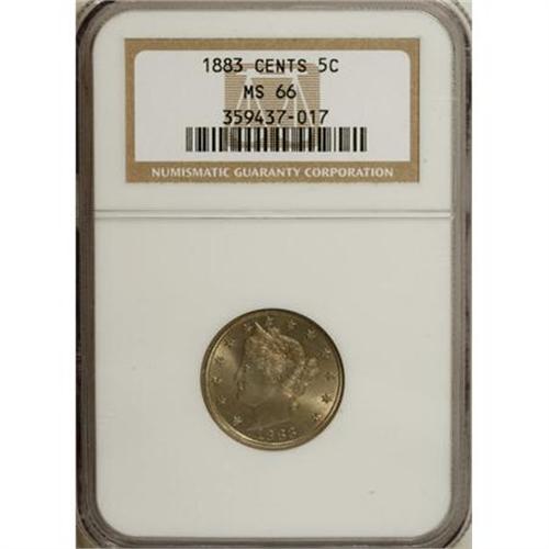 <B>1883 5C With Cents MS66 NGC.</B></I> NGC Census: (32/5). PCGS Population (44/1). Mintage: 16,032,983. Numismedia Wsl. Price for NGC/PCGS coin in MS66: $1,375. (#3844)<BR><BR><B>Coin Engraver:</B> Charles E. Barber<BR><BR><b>Shipping:</b> Coins & Currency (<a target="_blank" href="http://www.heritageauctions.com/common/shipping.php">view shipping information</a>\)
