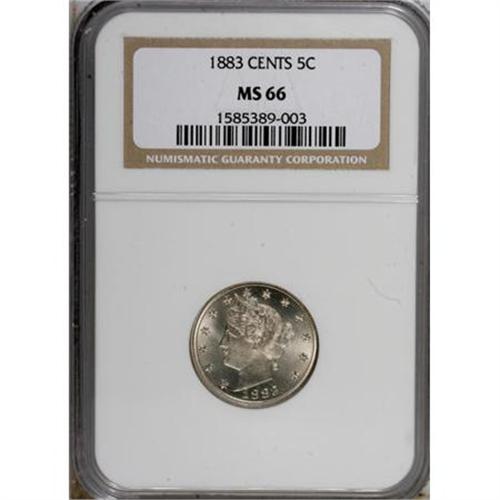 <B>1883 5C With Cents MS66 NGC.</B></I> While numerous No Cents Liberty nickels of 1883 survive in high Mint State grades today, considerably fewer of the With Cents pieces are known. This strongly lustrous example, well-defined at the centers with slight softness at a few of the stars, has traces of rose, peach, and orange toning at the margins.<BR><BR><B>Coin Engraver:</B> Charles E. Barber<BR><BR><b>Shipping:</b> Coins & Currency (<a target="_blank" href="http://www.heritageauctions.com/common/shipping.php">view shipping information</a>)