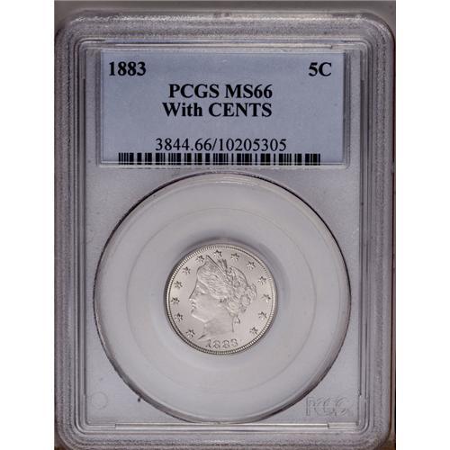 <B>1883<5C> With Cents MS66 PCGS.</B></I> Exceedingly bright and lustrous, with striking details that are nearly full, except on obverse star 11 and on the reverse left ear of corn. Wispy die cracks reside at the obverse and reverse borders. The silver-gray surfaces are untoned and nearly immaculate. A beautiful Premium Gem example of this first-year issue. <BR><BR><B>Important notice:</B> Heritage usually auctions material at the rate of 200-250 lots per hour. On some occasions eBay Live bid software or the Internet may not be able to keep up with the pace of the auction. We recommend placing a realistic absentee bid now as insurance to avoid disappointment. Occasionally the auctioneer may eliminate or reject an eBay Live bid, and the auctioneer may also reopen a lot after the close of the eBay live bidding (usually because we missed an audience bid), and may reject your bid even if it shows you as the winning bidder. By bidding via eBay Live, you agree that Heritage may award the lot to another bidder at its sole discretion under the circumstances described above or any other reasonable circumstances. Since eBay bids are not shown to us until we open the lot on the floor, we treat those bids just like floor bids. In most cases the floor responds before the eBay bid is presented to us, due to Internet lag time, so for consistency we have made it a policy that floor bids are always considered first over tie eBay live bids. Also please note that all Heritage lots purchased through eBay Live carry a 20% Buyer's Premium. Please make sure you read the Terms and Conditions before you bid. This lot is being auctioned in conjunction with a live floor auction by Heritage Galleries & Auctioneers. All final auction and invoice information will be supplied by Heritage Galleries & Auctioneers, and all other information should be considered preliminary. Lot:908 <BR><BR><B>Winning Notification and Billing:</B> After the FINAL session in this auction is complete, Heritage will send e-mail and snail mail invoices. This process normally takes several days. All final auction and invoice information will be supplied by Heritage Galleries & Auctioneers, and all other information should be considered preliminary. <BR><BR>This auction will be conducted on a live auction floor and over the Internet through eBay Live. If you choose to place an absentee bid, please take a moment to <font color='#0000ff'><u><a href='http://pages.ebay.com/liveauctions/help/before/laabsentee.html'>learn how eBay Live absentee bidding works</a></u></font><font color='#000000'>