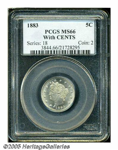 <B>1883<5C> With Cents MS66 PCGS.</B></I> Shimmering mint brilliance is seen over each side of this well struck Gem. Premium Gem quality and not seen all that often in this superior state of preservation. Population: 31 in 66, 1 finer (5/05).<BR><I>From The Western Hills Collection.</B></I>