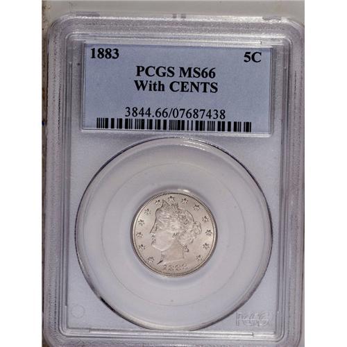 <B>1883<5C> With Cents MS66 PCGS.</B></I> Unlike the No Cents variety, this design was not saved in quantity. That makes this champagne-toned, highly lustrous piece a condition rarity. PCGS has graded just one coin finer than this highly detailed example (7/06).