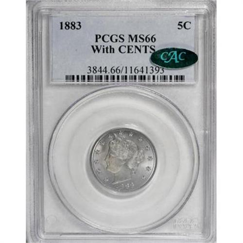 <B>1883 5C With Cents MS66 PCGS. CAC.</B></I> Elegant periwinkle-blue and lavender overtones drape the softly shimmering surfaces of this remarkable With Cents piece. Despite a generous mintage, the 1883 With Cents is a rarity any finer, with only five such pieces in the combined certified population (11/07).<BR><BR><B>Coin Engraver:</B> Charles E. Barber<BR><BR><b>Shipping:</b> Coins & Currency (<a target="_blank" href="http://www.heritageauctions.com/common/shipping.php">view shipping information</a>)