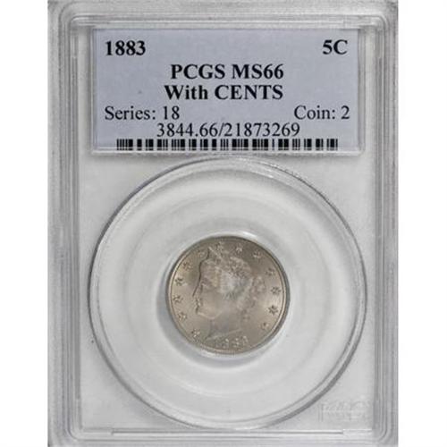 <B>1883 5C With Cents MS66 PCGS.</B></I> Low intensity gold-tan color visits radiantly lustrous, well cared for surfaces that reveal one minute mark on the chin. Sharply struck, save for the typically soft elements left of the bowknot. Population: 45 in 66, 1 finer (12/07).<BR><BR><B>Coin Engraver:</B> Charles E. Barber<BR><BR><b>Shipping:</b> Coins & Currency (<a target="_blank" href="http://www.heritageauctions.com/common/shipping.php">view shipping information</a>)